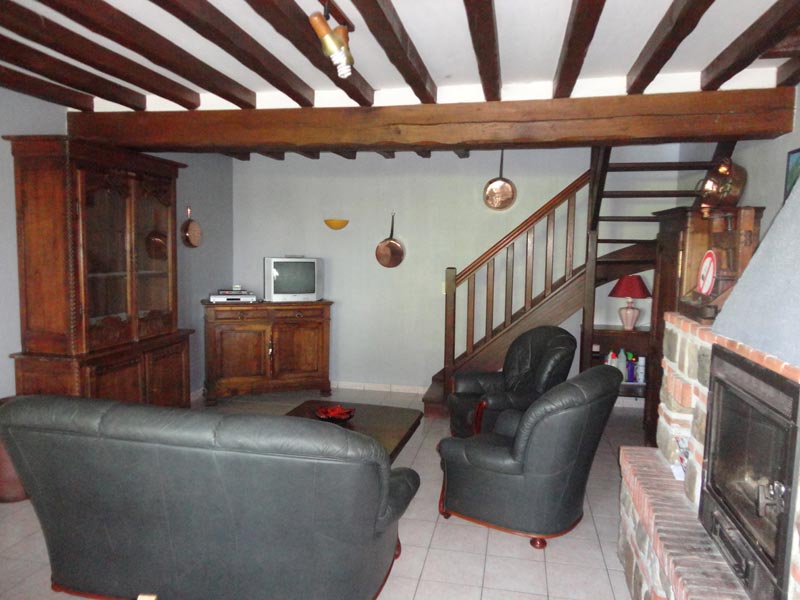 SALLE, SALON : Surface 35m2 - Un canapé de trois pers en cuir - Deux fauteuils en cuir - Une chaise bébé - Une table de salon en bois - Une grande table rectangulaire en bois pouvant accueillir 8 personnes - Un buffet en bois avec toute la vaisselle nécessaire pour 8 personnes - Un téléviseur - Chaînes Françaises - Chaînes étrangères - DVD - Une cheminée - Un escalier de meunier - Chauffage central avec deux radiateurs - Sol en carrelage - Trois portes fenêtres avec volets en bois.