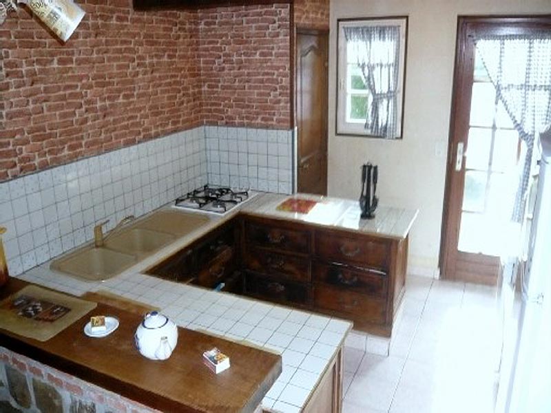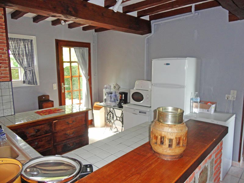 CUISINE : Surface 10m2 - Une fenêtre avec volets en bois - Une porte fenêtre avec volet en bois - Meuble de cuisine - Plan de travail en carrelage, 2m linéaire - Sol en carrelage - Nécessaires pour faire la cuisine pour 8 personnes - Evier avec deux bacs - Robinet mitigeur eau chaude et eau froide - Egouttoir à vaisselle - Plaque de cuisson avec quatre brûleurs - Grille pain - Cafetière électrique - Micro Onde - Mini four - Lave vaisselle - Extincteur 3 feux - Frigo avec conservateur - Congélateur - Chauffage central avec un radiateur.